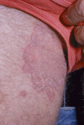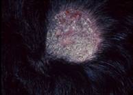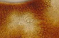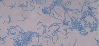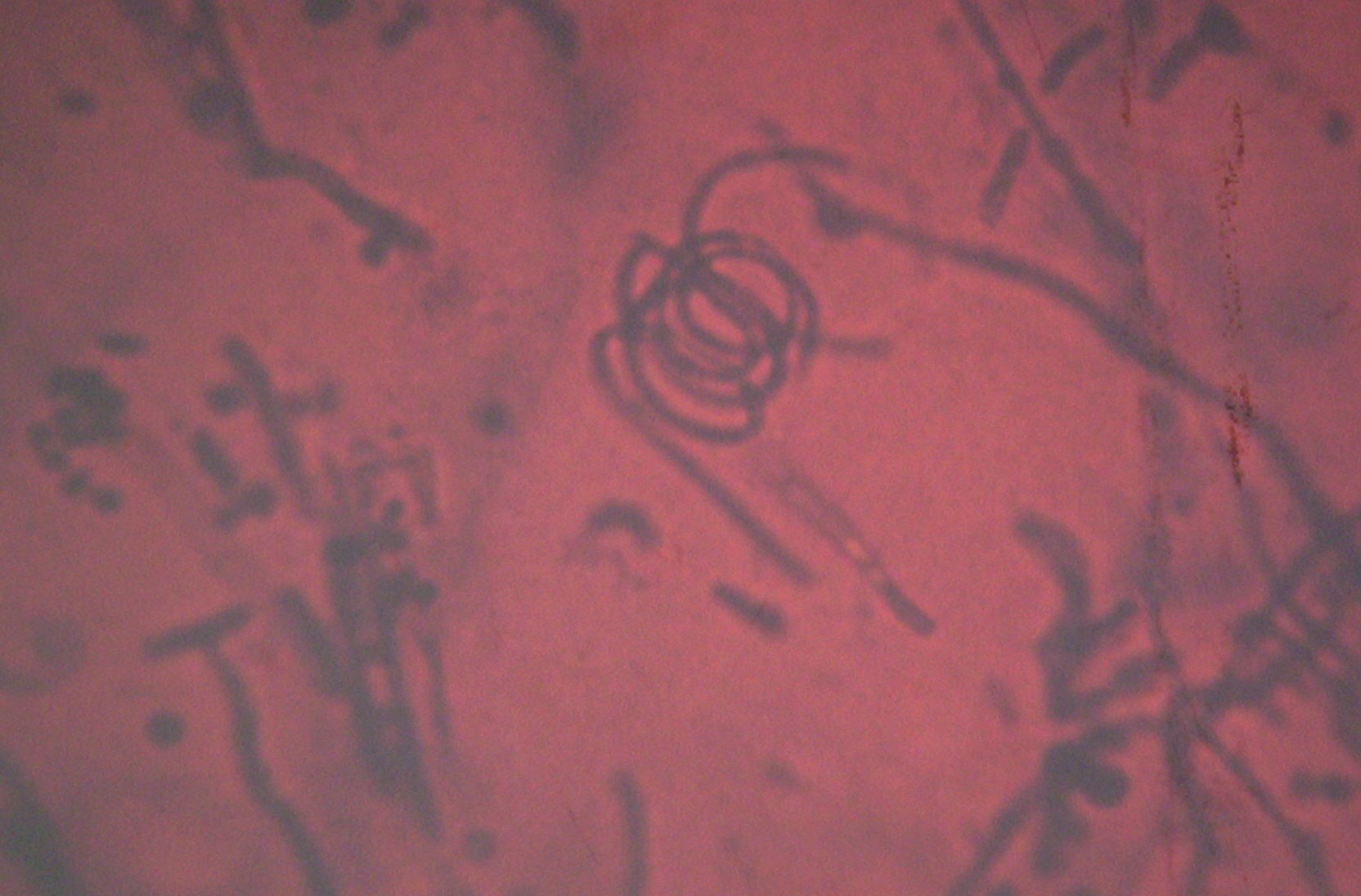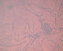 Examen directo de escamas: blastosporas con fragmentos de hifas